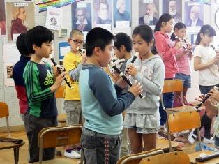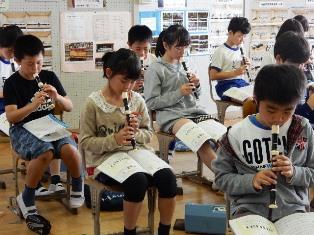 5年生は音楽の授業で、リコーダーで2部合奏をしています。