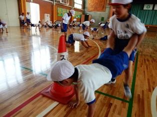 3年生は体育の授業で、手押し車で班ごとに競争しています。