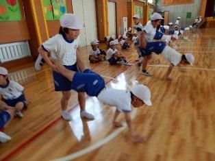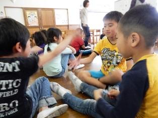 4年生は体育館で風船を活用した二人一組のゲームを行っ