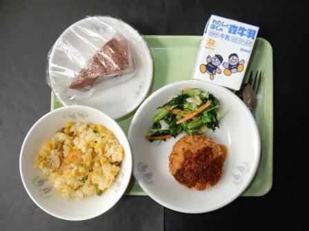 キャロットライス、コロッケ、おかひじきのサラダ、牛乳です。4月が誕生月の児童には、