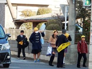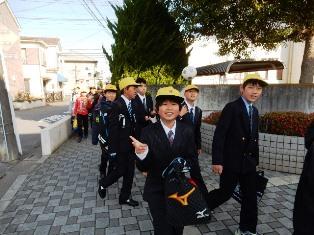 黄色いランドセルカバーを掛けて1年生が、初めての通学班での登校です。