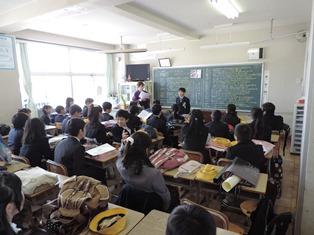 学級の時間で担任の先生の話を真剣に聴いている6年生です。