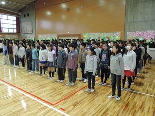 全員で校歌と今月の歌「はじめの一歩」を歌い、6年生の退場