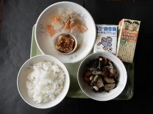 磯煮、牛乳です。交流給食のクラスは、オレンジジュースが