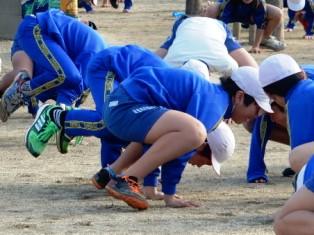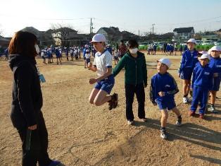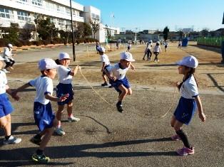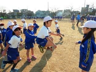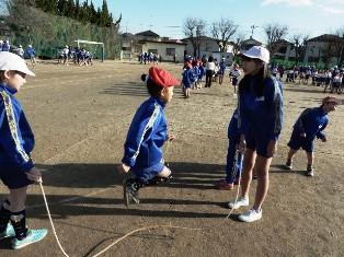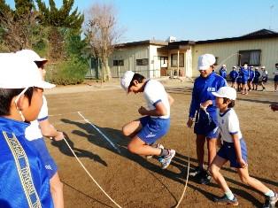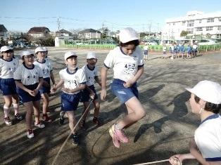 こちらも1年生が朝マラソン前になわとびの練習です。交差跳びが