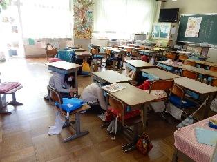 校舎内にいた子どもたちは、近くの教室の机の下に隠れます。