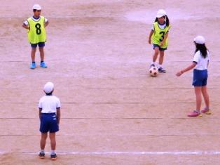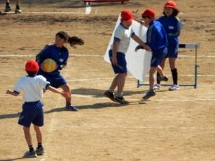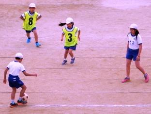 3年生の授業は体育で、バスケット型のボールゲームを行っています。