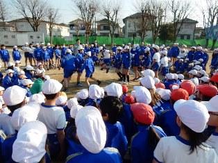 朝マラソン前に1年生がたくさん集まってきて、長縄跳びの