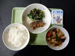 ごはん、ぶりのみりん焼き、煮浸し、豚汁、牛乳です。