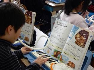 2年生は音楽の授業で、鍵盤ハーモニカと歌声で演奏しています。