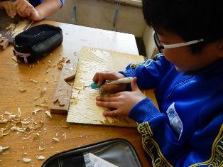 同じクラスでは、黙々と彫ることに集中している子どもたちがいます。