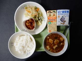 本日の献立は、ごはん、かに玉、野菜炒め、麻婆豆腐、牛乳です。