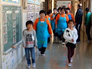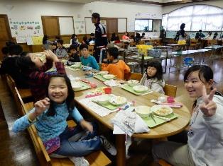 1年1組と5年1組はランチルームで交流給食です。たのしそうに、