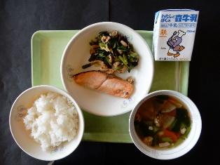 ごはん、鮭の塩焼き、煮浸し、すいとん、牛乳です。