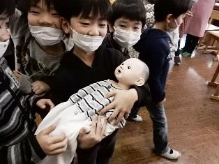 実習では、赤ちゃんと同じような人形を大切にだっこしています。