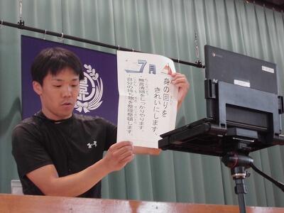続いて、生徒指導担当が、今月の生活目標「身の回りをきれいにします」について話をしました。1学期ももうすぐ終わりです。2学期を気持ちよく迎えられるようにきれいにしていきたいですね。