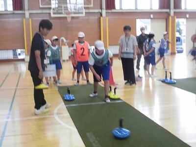 最初に練習をした後、試合を行いました。子供たちは、コツを覚え、自分のストーンを標的に近づけたり、自分のストーンで、相手のストーンを押し出したり、できるようになっていきました。