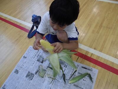 1年生がトウモロコシの皮むき体験を行いました。