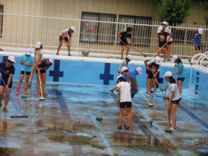 今年度の水泳学習に向け、6年生と教職員によるプール清掃が