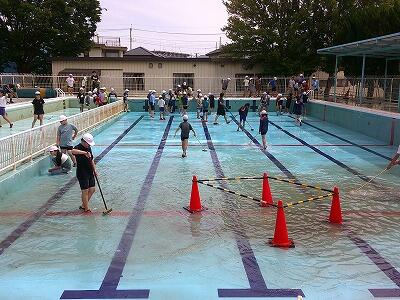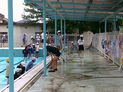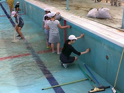 6年生がプールをきれいに掃除してくれました。底や壁、あちらこちらが、ヘドロで汚れていました。