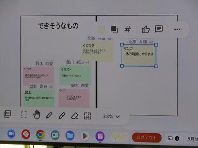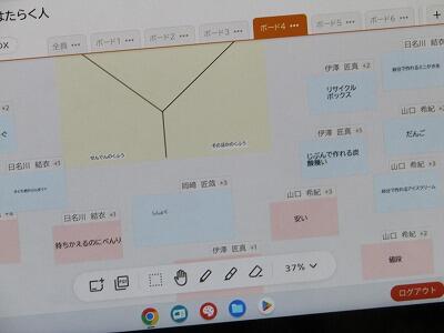 タブレット端末を使って、グループの意見を分類集計しながら、話し合いを進めていきます。話し合いをすることで新たなアイディアが生まれ、新たな発見がありました。
