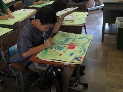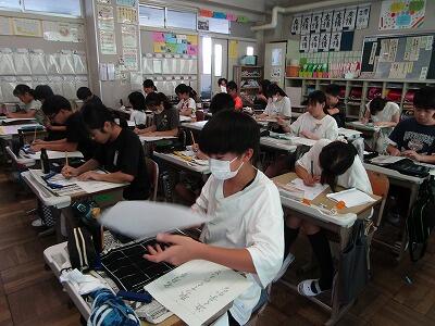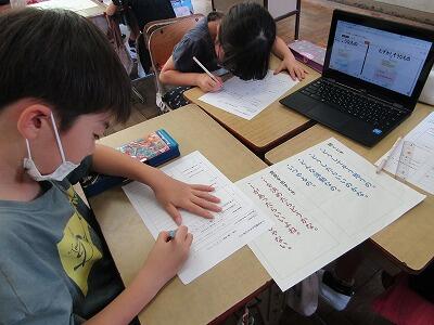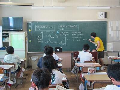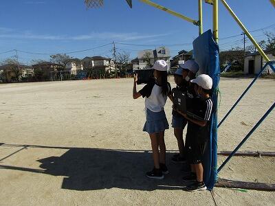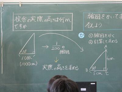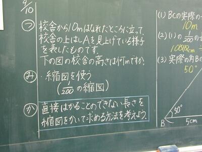 6年生では、比の学習を進めていますが、今日は縮図を使って、校舎の高さを求めました。
