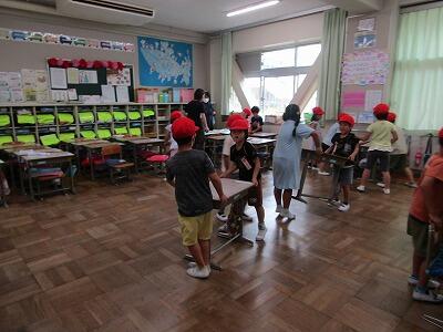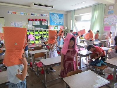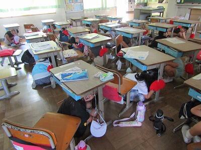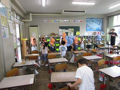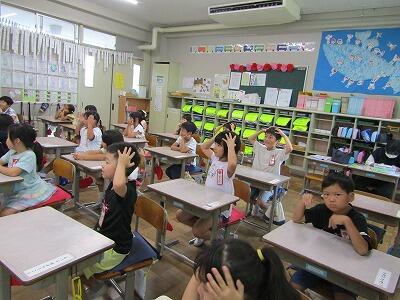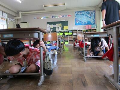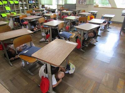 訓練方法はいたってシンプルで、指定された日時に、地震から身を守るための3つの安全行動①まず低く②頭を守り③動かないを約1分間行います。今日は3つの行動に加えて、防災頭巾をかぶり避難のために並ぶところまで実施しました。