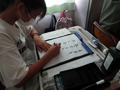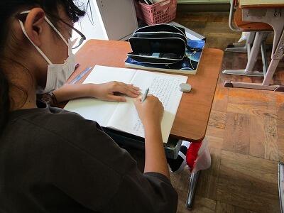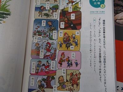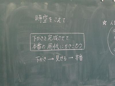 まず、記憶をもとにそれぞれが、おむすびころりんの物語を書き出します。書き出した物語をつなぎ言葉を使って、完成させます。