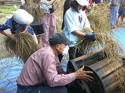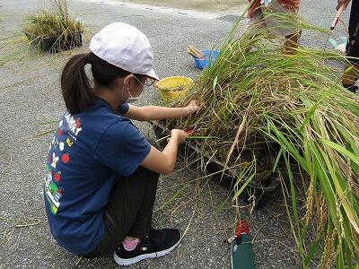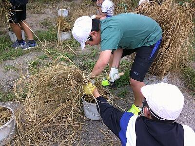 今日は、学校ファームボランティアとしてご指導いただいている地域の方に、稲の刈り方や脱穀の仕方をご指導いただきました。