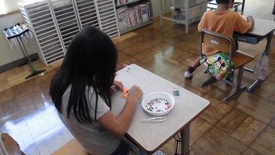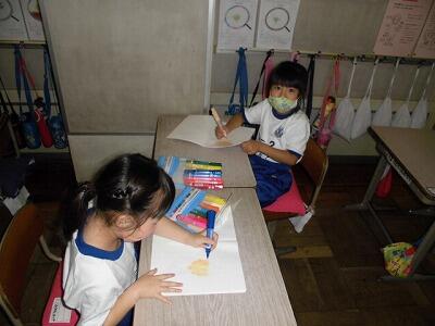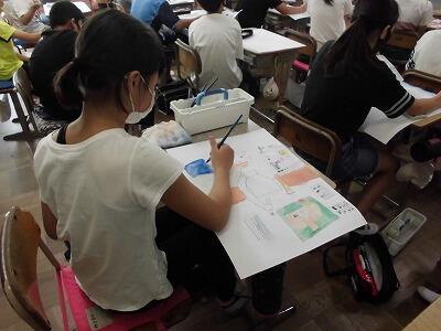 図工では、絵の具を使って色塗りが始まりました。塗り方、色の作り方等、教わったことをしっかりと行っています。