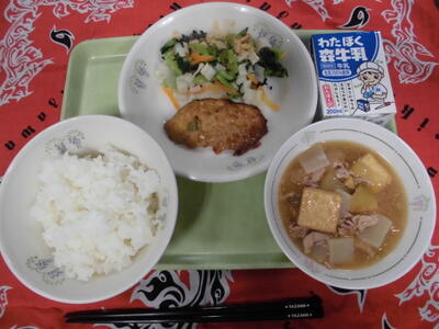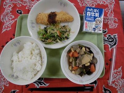 本日の給食は、ごはん、牛乳、ささみのフライ、ハリハリ漬け、五目煮でした。ささみのフライはとてもやわらかく、おやつみたいで子ども達から人気でおいしかったです。