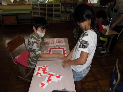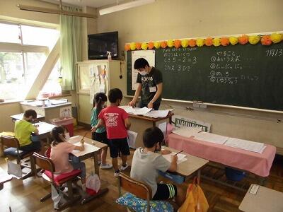 子ども同士の教え合いも、時間は短いですが行っています。ミニ先生となりわからないお友達に丁寧に教えてあげてくれています。