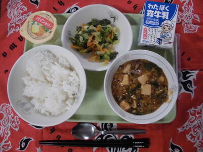 今日の給食は、スパゲッティ、牛乳、ミートソース、キャベツとじゃこのサラダ、きなこチーズ蒸しパンでした。ミートソースはとってもおいしく、蒸しパンも子ども達はうれしそうにおいしく食べていました。