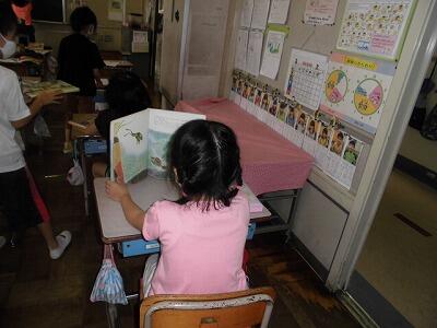 1年生の休み時間の様子です。自分の席に座って本を読んだり、絵を描いたりして楽しんでいます。