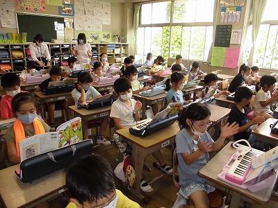 音楽の時間の様子です。鍵盤の指の動きの確認を子ども同士で行っています。ソーシャルディスタンスを保ちながら友達と関わりが持てる工夫をしています。