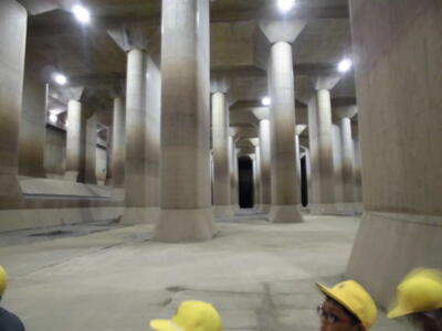 首都圏外郭放水路では、係員の方から、放水路の説明をしてもらった後、長い階段を下り、貯水槽に下りていきました。地下神殿のような壮大なつくりに子ども達は、圧倒されました。