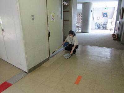 職員玄関にゴミが落ちていたことに気づいた職員が掃除を。