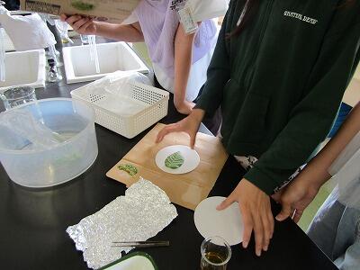ヨウ素液を使って、日光に当てたジャガイモの葉とアルミホイルで日光をさえぎったジャガイモの葉を比べます。