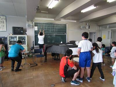 教師のばちさばきに合わせて、リズムに気を付けながらたたきます。