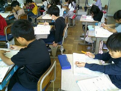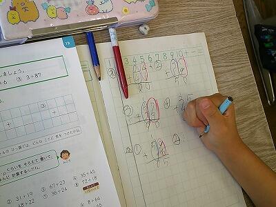 繰り上がりのひっ算の学習をしています。1の位を足して10になると十の位に1繰り上がります。こどもたちがそれぞれ解いた後、みんなで答え合わせを丁寧に行いました。
