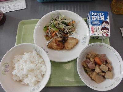 ごはん、牛乳、戻りガツオの南蛮漬け、もやしの辛し和え、筑前煮