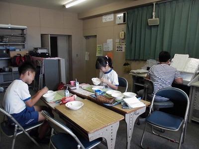 毎日、交代で給食の放送をしている放送委員の子どもたちです。放送室で給食を食べています。