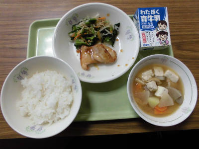 ごはん、牛乳、とり肉の照り焼き、切り干し大根のごま和え、具だくさんみそ汁