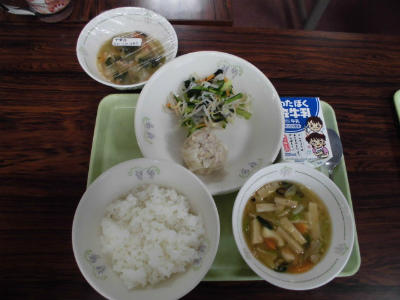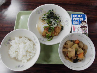 本日の給食は、ごはん、牛乳、とり肉の唐揚げ、卯の花の炒り煮、沢煮椀でした。