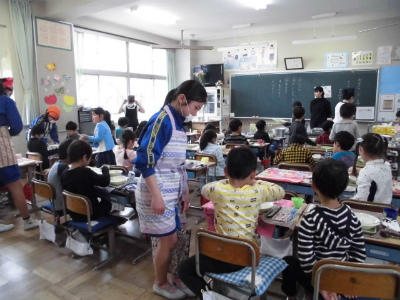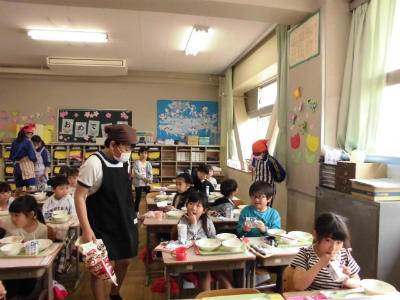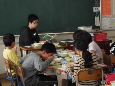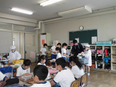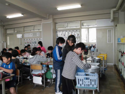 先生も給食当番です。本を読んで待つ子どももいます。
