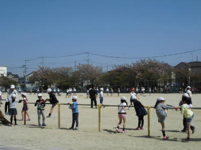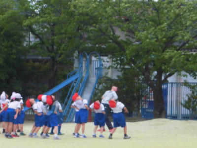 白い帽子が2年生、赤い帽子が1年生、暑くなってきた昼前、校庭で元気に遊びました。