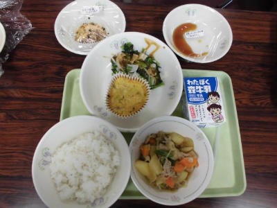 本日の給食は、麦ご飯、牛乳、いかのバター焼き、即席漬け、じゃがいものそぼろ煮