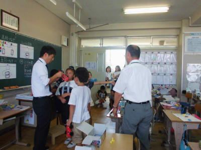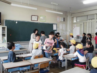 1年生の教室では、6年生が片付け方を教えてくれます。