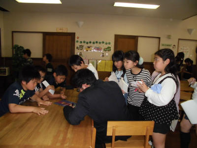4年生 外国語活動 友だちとジャンケンをしたりカードをヒントにしたりしながら、英語でコミュニケーションしています。
