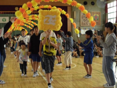 1年生の入場、退場の様子です。6年生は先導し、手を繋いで、上級生としての役割を果たします。